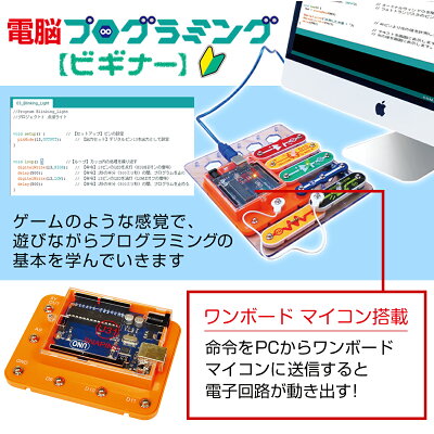 商品名 電脳プログラミング ビギナー 商品番号 ds009(JAN:4562262011584) 商品内容 Arduino UNO・ベース基板・スナップワイヤー・ジャンプワイヤー・9V乾電池ケース・スイッチ・その他回路・9V乾電池付属 日本語取扱説明書(実験ガイド、テンプレートプログラム解説付き) ※パーツの数量や種類は、シリーズにより異なる。