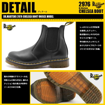 Item Spec ブランド DR.MARTENS ドクターマーチン アイテム シューズ スタイルNo 2227001 22227600 商品名 2976 チェルシー ブーツ 性別 メンズ レディース 原産国 Thailand 素材 アッパー:天然皮革(SMOOTH) アウトソール:ゴム底 重量 片足:UK8.0(27cm) 約 658g 商品特性1 こちらの商品は1cm刻みの展開になります。