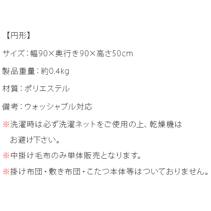 サイズ:幅90×奥行き90×高さ50cm 製品重量:約0.4kg 材質:ポリエステル 備考:ウォッシャブル対応※洗濯時は必ず洗濯ネットをご使用の上、乾燥機はお避け下さい。