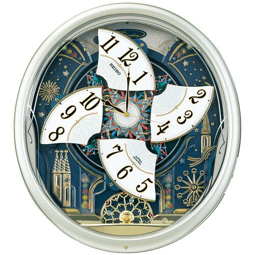 SEIKO 商品仕様 枠材 プラスチック枠 薄金色パール塗装 光沢仕上げ 前面:ガラス サイズ重さ 468x424x109mm 3.5kg 電池 単1(アルカリ)×4 単3(マンガン)×2 (電池寿命約1年間) 機能 電波修正機能(40kHz/60kHz自動選局・受信OFF機能つき) 正時パフォーマンス&6曲メロディ(ハイファイ音源・クリスタルベル音) 店頭陳列用オープン固定機能 光センサーによる自動鳴止め 音量調節 報時モニター機能 LEDライト点滅(20ヶ所) 一方向回転飾り(スワロフスキー®・クリスタル使用) パフォーマンス時回転飾り(スワロフスキー®・クリスタル使用) 電池切れ予告機能(秒針停止) ステップセコンド おやすみ秒針(光センサーによる自動秒針停止機能) 1.毎正時、オープニングの曲とともに2筋の花火が上がるようにLEDライトが点滅し、メロディに合わせて文字板がゆっくりと4方向に分かれます。